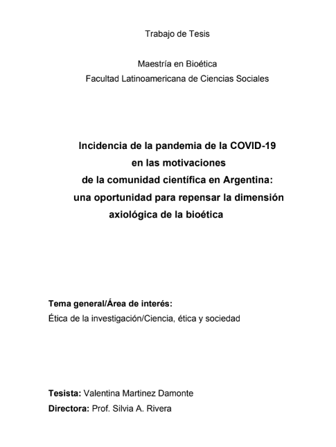 Martínez Damonte, Valentina (2023). Incidencia de la pandemia de la COVID-19 en las motivaciones de la comunidad científica en Argentina : una oportunidad para repensar la dimensión axiológica de la bioética. Tesis de Maestría. FLACSO. Sede Académica Argentina, Buenos Aires.