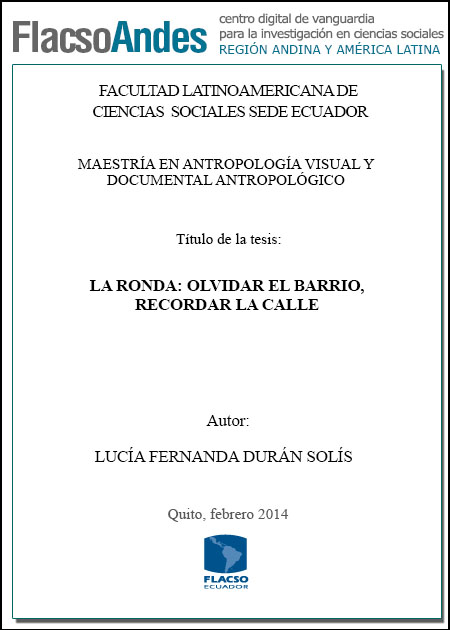 Durán, L. F. (2014). La Ronda: olvidar el barrio, recordar la calle (Tesis de Maestría en Antropología Visual y Documental Antropológico). FLACSO Sede Ecuador, Quito.