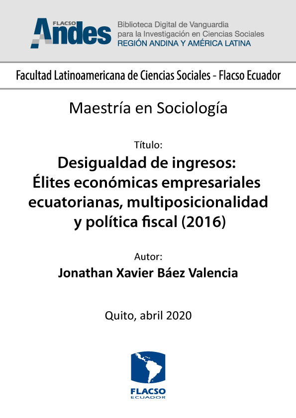 Báez Valencia, Jonathan Xavier. 2020. Desigualdad de ingresos: Élites económicas empresariales ecuatorianas, multiposicionalidad y política fiscal (2016). Tesis de maestría, Flacso Ecuador.