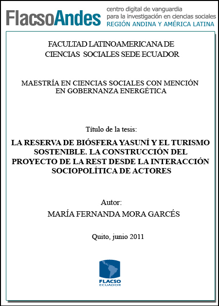 Mora Garcés, María Fernanda (2011). La Reserva de Biósfera Yasuní y el turismo sostenible : la construcción del proyecto de la REST desde la interacción sociopolítica de actores. Maestría en Ciencias Sociales con mención en Gobernanza Energética; FLACSO - Sede Ecuador. Quito. 136 p.