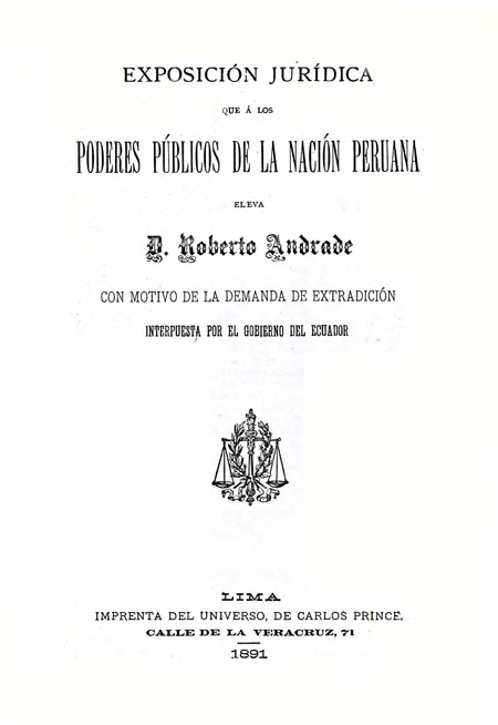 Andrade, D. Roberto. 1891. Exposición jurídica que á los poderes públicos de la nación peruana eleva D. Roberto Andrade con motivo de la demanda de extradición interpuesta por el Gobierno del Ecuador. Lima, Perú : Imprenta del Universo.