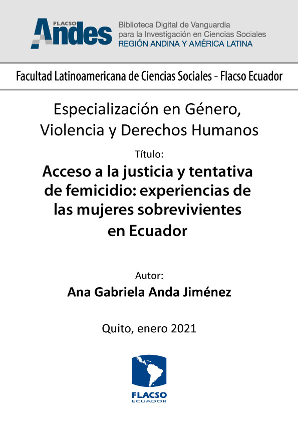Anda Jiménez, Ana Gabriela. 2021. Acceso a la justicia y tentativa de femicidio: experiencias de las mujeres sobrevivientes en Ecuador. Tesina de especialización, Flacso Ecuador.
