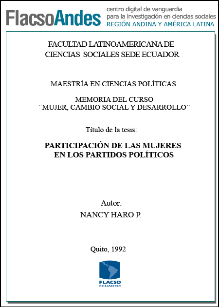 Haro P., Nancy (1992).La participación de las mujeres en los partidos políticos: memoria del curso "mujer, cambio social y desarrollo"; Maestría en Ciencias Políticas. FLACSO Sede Ecuador. Quito. 103 p.