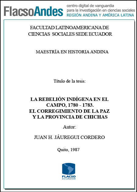 Jáuregui Cordero, Juan H. (1987). La rebelión indígena en el campo, 1780 – 1783: el corregimiento de la Paz y la provincia de Chichas. Maestría en Historia Andina; FLACSO sede Ecuador. Quito. 142p.