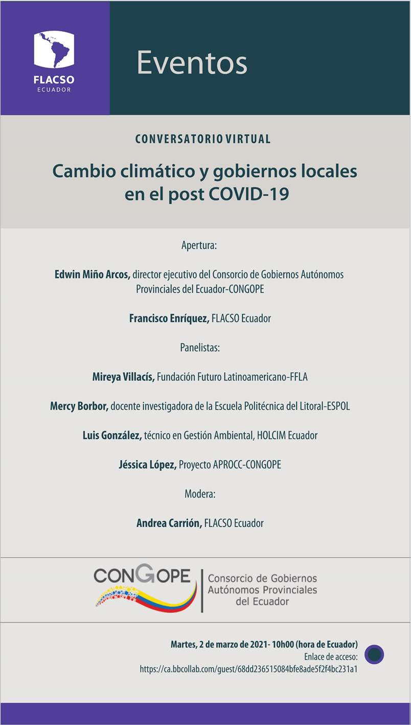 FLACSO Ecuador invita al Conversatorio virtual: Cambio climático y gobiernos locales en el post Covid-19, el 02 de marzo de 2021- 10h00 : FLACSO Ecuador, Quito.