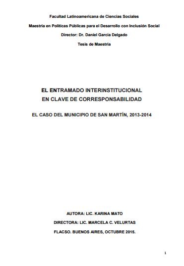 Mato, Karina (2015). El entramado interinstitucional en clave de corresponsabilidad : el caso del municipio de San Martín, 2013 - 2014. Tesis de Maestría. FLACSO. Sede Académica Argentina, Buenos Aires.
