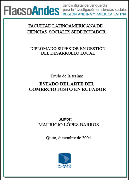 López Barros, Mauricio (2004). Estado del arte del comercio justo en Ecuador. Diploma Superior en Gestión del Desarrollo Local; FLACSO - Sede Ecuador. Quito. 44 p.