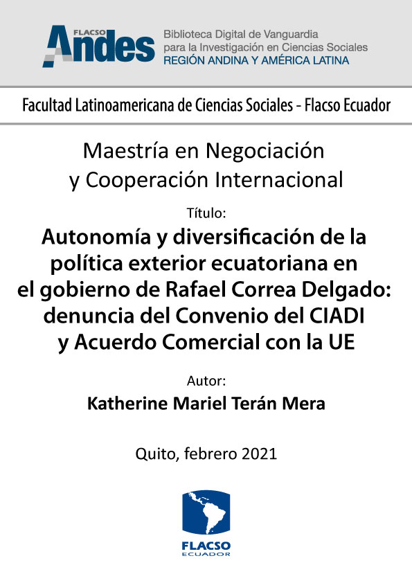Terán Mera, Katherine Mariel. 2021. Autonomía y diversificación de la política exterior ecuatoriana en el gobierno de Rafael Correa Delgado: denuncia del Convenio del CIADI y Acuerdo Comercial con la UE. Tesis de maestría, Flacso Ecuador.