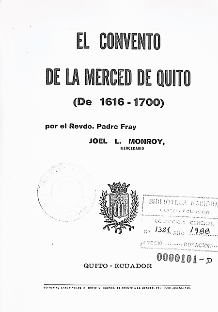 En virtud de la anterior comisión, y habida cuenta de lo prescrito en el canon 1393 del Código Eclesiástico, cúmpleme informar a V. S. Rvdma. que he leído, con la debida atención, la obra histórica de 470 páginas, que, con el título de El Convento de la Merced de Quito – de 1617 a 1670 (segunda parte) por fray Joel L. Monroy, Mercedario, ha presentado su autor para la censura de ley, sin hallar en ella, a mi juicio, nada contrario al Dogma ni a la Moral. Y en cuanto a la veracidad histórica, cabe decirme que el Rdo. Padre Visitador de Mercedarios ha tenido muy en cuenta lo que prescribiera Su Santidad el Papa León XIII, en carta a los Cardenales Luca, Pitra y Hergenröther, a saber: Ha de procurarse sobremanera que todo lo falso y mentiroso quede refutado, acudiendo a las fuentes; teniendo ante todo presente que es primera ley de la Historia, que no se atreva a decir cosa alguna falsa, ni tema decir cosa alguna verdadera.