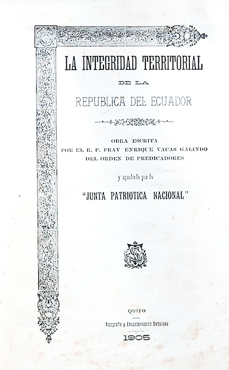 Tengo el honor de comunicar a usted que la Junta Patriótica Nacional aprobó ayer la siguiente moción: Dése un voto de aplauso al R. P. Fr. Enrique Vacas Galindo por su último libro sobre la controversia de límites, el cual bastaría para evidenciar nuestros derechos, y manifiéstese que el autor ha consagrado su vida a la defensa del honor y del territorio ecuatorianos.