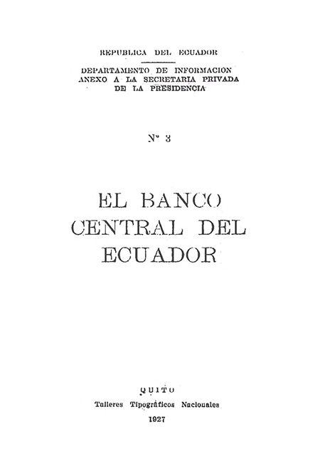 El Banco Central fue creado por el Decreto-Ley de 4 de marzo de 1927, dictado por el señor Dr. Don Isidro Ayora, Presidente Provisional de la República, de acuerdo con el Consejo de Ministros y con el proyecto de ley presentado por la Comisión de Consejeros Financieros, presidida por el profesor F. W. Cenmierer.