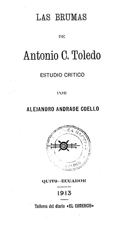 Al público Señor Don Alejandro Andrade Coello. Presente. Estimado señor y amigo: Cuando usted patriótica y desinteresadamente me presentó, anticipándose a toda idea o proyecto, su meritísima compilación de Los Brumos de nuestro malogrado y sentimental poeta Antonio C. Toledo, junto con la crítica de ellas, no vacilé en editar la obra, porque veía en ello la gloria de la Patria y del Poeta.