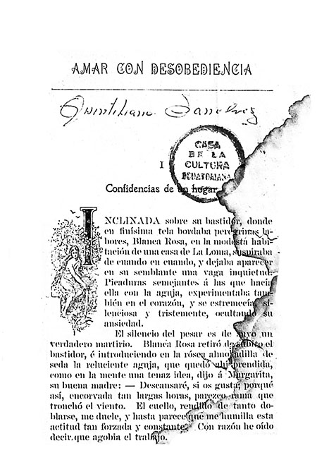 Inclinada sobre su bastidor, donde en finísima tela bordaba peregrinas labores, Blanca Rosa, en la modesta habitación de una casa de La Loma, suspiraba de cuando en cuando, y dejaba aparecer en su semblante una vaga inquietud. Picaduras sangrientas de las que hacía con la aguja, experimentaban también en el corazón, y se estremecía dolorosa y tristemente, ocultando su ansiedad.