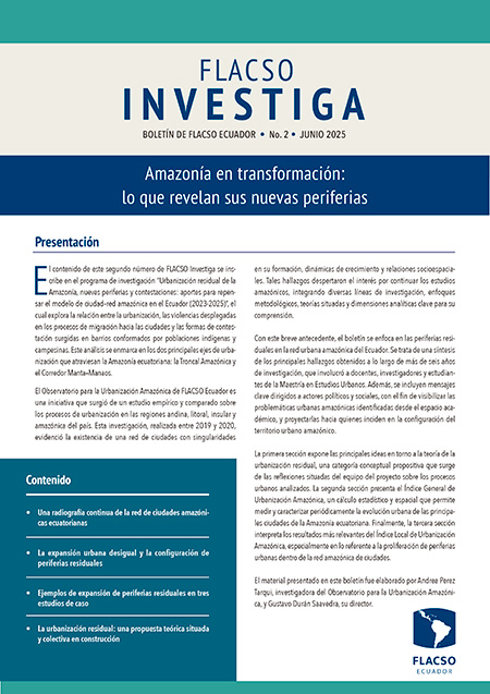 El contenido de este segundo número de FLACSO Investiga se inscribe en el programa de investigación “Urbanización residual de la Amazonía, nuevas periferias y contestaciones: aportes para repensar el modelo de ciudad–red amazónica en el Ecuador (2023-2025)”, el cual explora la relación entre la urbanización, las violencias desplegadas en los procesos de migración hacia las ciudades y las formas de contestación surgidas en barrios conformados por poblaciones indígenas y campesinas. Este análisis se enmarca en los dos principales ejes de urbanización que atraviesan la Amazonía ecuatoriana: la Troncal Amazónica y el Corredor Manta–Manaos.