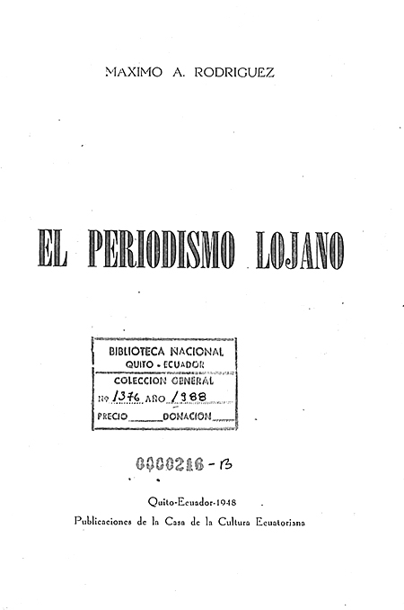 En 1922, con ocasión de la celebración del Primer Centenario de la Batalla de Pichincha, que consolidó la independencia patria, y como un tributo a la memoria de nuestros libertadores, publiqué un ensayo sobre la Literatura Lojana, en el que me refería al periodismo en forma sintética, y al que el Sr. Dr. Máximo Rodríguez ha dedicado este libro.