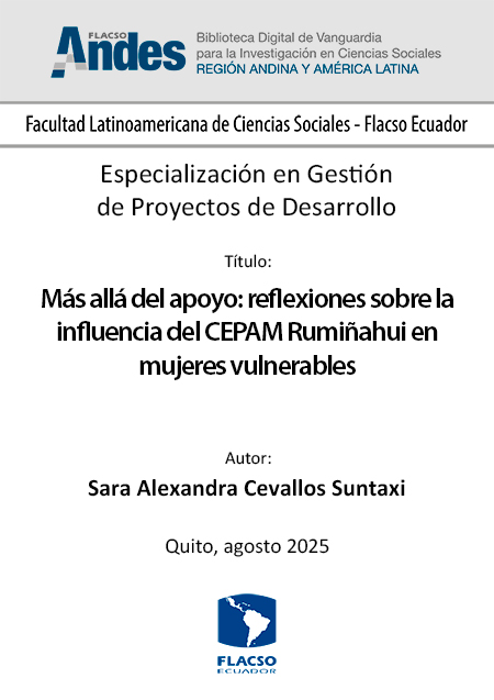 La presente investigación tiene como propósito evaluar la influencia del Centro Ecuatoriano para la Promoción y Acción de la Mujer "CEPAM" en el bienestar integral de las mujeres que afrontan violencia de género en el cantón Rumiñahui; por ello, se describe y analiza los servicios proporcionados por el centro para la atención integral a mujeres víctimas de situaciones violentas con el fin de evaluar la influencia de los servicios de CEPAM Rumiñahui en el bienestar integral de las mismas.